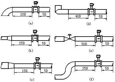 2) 配管應(yīng)與傳感器同心,同軸度應(yīng)小于0.05D`。