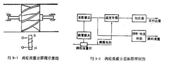 渦輪的轉速通過裝在機殼外的傳感線圈來檢測。當渦輪葉片切割由殼體內永久磁鋼產生的磁力線時,就會引起傳感線圈中的磁通變化。傳感線圈將檢測到的磁通周期變化信號送入前置放大器,對信號進行放大、整形,產生與流速成正比的脈沖信號,送入單位換算與流量積算電路得到并顯示累積流量值;同時亦將脈沖信號送入頻率電流轉換電路,將脈沖信號轉換成模擬電流量,進而指示瞬時流量值。