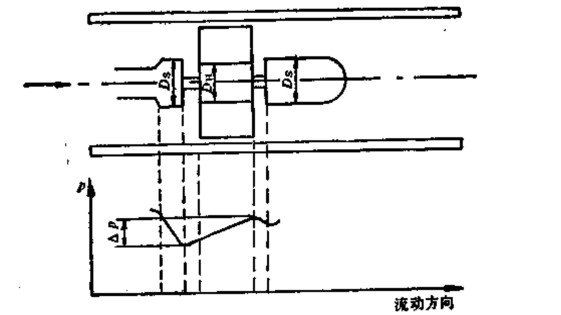 由于流體通過渦輪時會對渦輪產生一個軸向推力,使鈾承的摩擦轉矩增大,加速鈾承磨損,為了消除軸向力,需在結構上采取水力平衡措施,這方法的原理見圖3-3所示。由于渦輪處直徑DH略小于前后支架處直徑Ds,所以,在渦輪段流通截而擴大,流速降低,使流體靜壓上升 P,這個 P的靜壓將起到抵消部分軸向推力的作用。