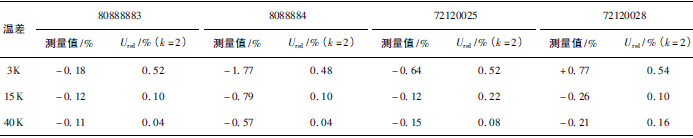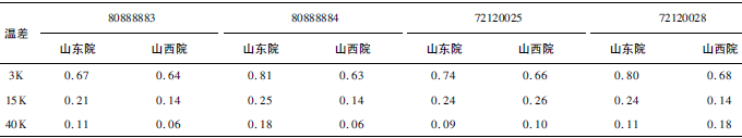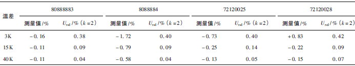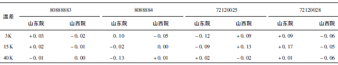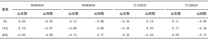 (1)熱量相對示值誤差測量結(jié)果中,兩院在15K點處與參考值的差值最大,山東院為+0.17K(72120028);山西院為+0.13K(72120025)。由于3K溫差對相對誤差來說要求較高,所以差值的擴展不確定度也較大,為0.63%~0.81%。
