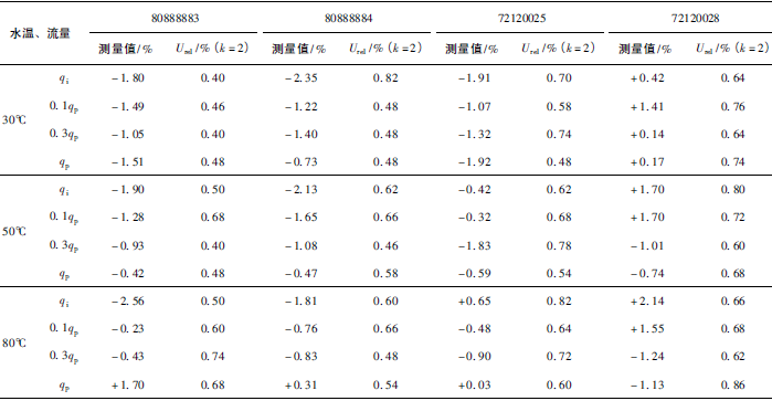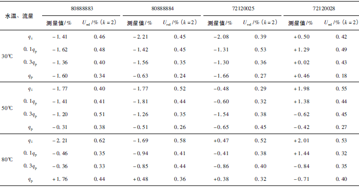(3)累積體積(標(biāo)準(zhǔn)表法)相對示值誤差測量結(jié)果中,山東院在水溫30℃、qi點處與參考值的差值最大,為+0.31%(80888883);山西院在水溫80℃、qp點處與參考值的差值最大,為-0.24%(72120028)。同樣在標(biāo)準(zhǔn)表法中比對樣品在一些試驗點上的測量重復(fù)性也不是很好,差值的擴展不確定度最大達(dá)到了1.41%。