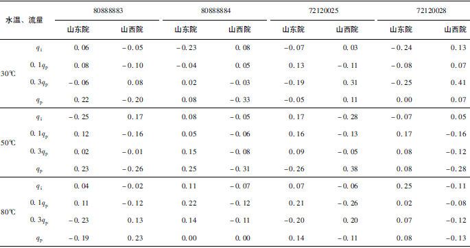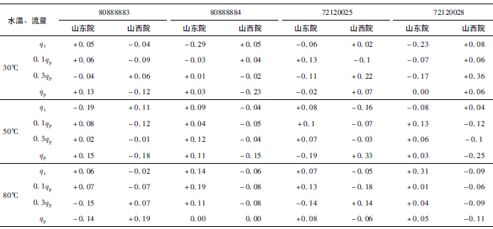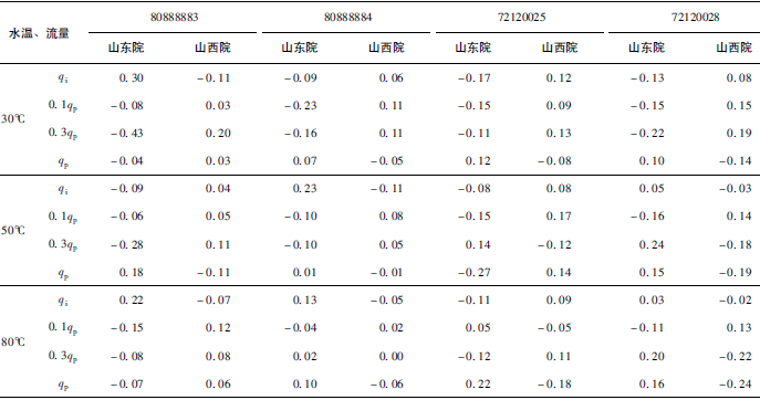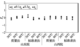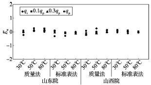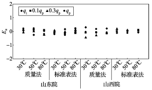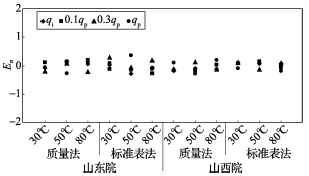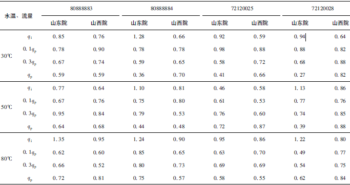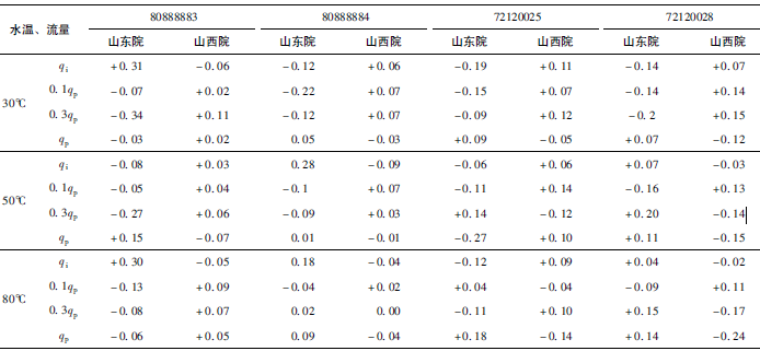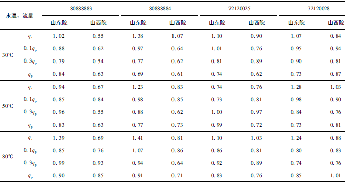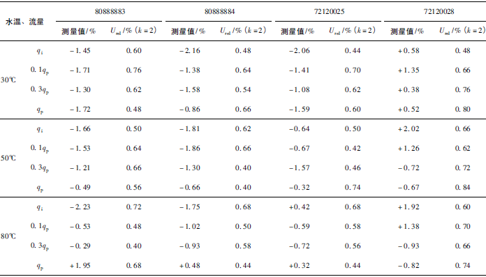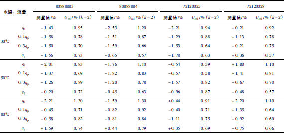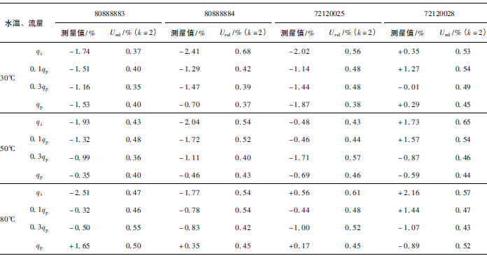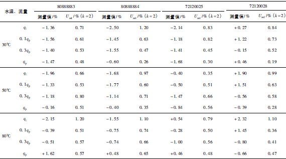 (2)累積體積(質(zhì)量法)相對示值誤差測量結(jié)果中,山東院在水溫80℃、qi點處與參考值的差值最大,為+0.31%(72120025);山西院在水溫30℃、0.3qp點處與參考值的差值最大,為+0.36%(72120028)。由于比對樣品在一些試驗點上的測量重復(fù)性不是很好,差值的擴展不確定度最大達(dá)到了1.35%。