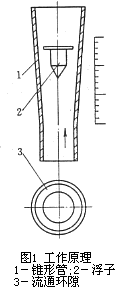 金屬轉(zhuǎn)子流量計(jì)的流量檢測元件是由一根自下向上擴(kuò)大的垂直錐形管和一個(gè)沿著錐管軸上下移動(dòng)的浮子組所組成。工作原理如圖1所示,被測流體從下向上經(jīng)過錐管1和浮子2形成的環(huán)隙3時(shí),浮子上下端產(chǎn)生差壓形成浮子上升的力,當(dāng)浮子所受上升力大于浸在流體中浮子重量時(shí),浮子便上升,環(huán)隙面積隨之增大,環(huán)隙處流體流速立即下降,浮子上下端差壓降低,作用于浮子的上升力亦隨著減少,直到上升力等于浸在流體中浮子重量時(shí),浮子便穩(wěn)定在某一高度。浮子在錐管中高度和通過的流量有對應(yīng)關(guān)系。