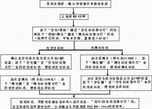 本界面變送器必須用水(不能用油水混和物)作物料,進行空倉和滿倉兩次標定以后才能正常運行,可先標定空倉,再標定滿倉,也可先標定滿倉,再標定空倉,過程如下: