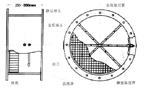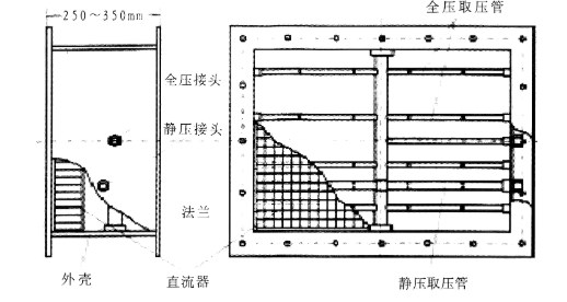 由圖可以看出,該裝置不管管道截面積多大,其長度都在250-300mm之間。在該裝置的入口端是布滿整個截面積的直流器,擾動的氣流經過直流器的整流,變成平穩的氣流。在直流器之后,裝有在管道橫截面上按一定規律排列的橫截面速度取壓管,將流速不相同的動壓經裝置變成較平穩的信號。