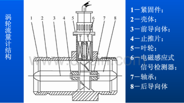 渦輪流量計是一種速度式流量計。如下圖所示,在管道中心安放一個渦輪,兩端由軸承支撐,當(dāng)流體通過管道時,沖擊渦輪葉片,對渦輪產(chǎn)生驅(qū)動力矩,使渦輪克服摩擦力矩和流體阻力矩而產(chǎn)生旋轉(zhuǎn).在一定的流量范圍內(nèi),對一定的流體介質(zhì)粘度,渦輪的旋轉(zhuǎn)角速度與流體流速成正比.由此,流體流速可通過渦輪的旋轉(zhuǎn)角速度得到,從而可以計算得到通過管道的流體流量。