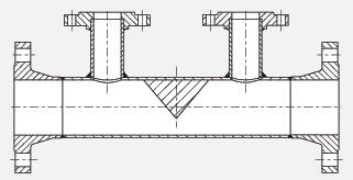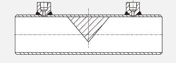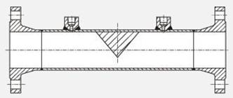 楔形流量傳感器結構如右圖所示。楔形流量傳感器的檢測件是楔形孔板,它是一塊V形節流件,它的圓滑頂角朝下,這樣有利于含懸浮顆粒(粉塵、泥沙及其它固體顆粒)流體和高粘度液體流過時在節流件上游側不會產生滯流,也不會在節流體上、下游側發生固體顆粒或粘稠物的積存,從而確保了楔形流量傳感器長期運行精度在0.2級,這樣高的長期運行精度在流量測量領域是迄今少見的。 |