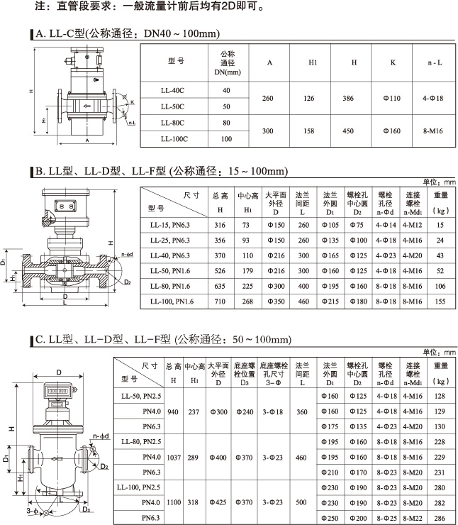 一、確定公稱通徑:根據實際工作時的流量Q(常用流量),按照30%Qmax<Q<80%Qmax,確定Qmax,并由Qmax,從“主要技術指標”表中,確定流量計的公稱通徑。