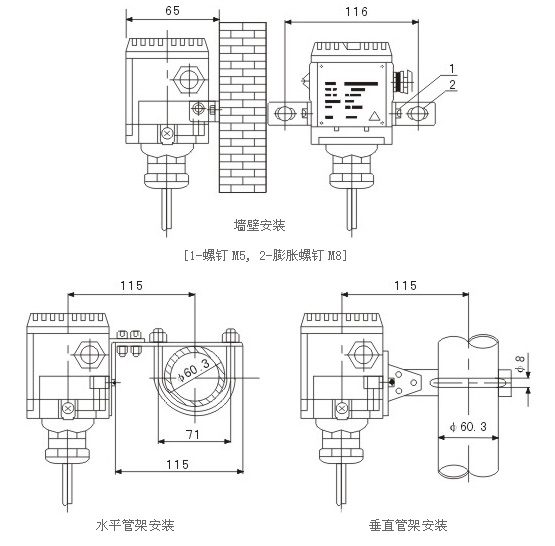 LK-LC/LR型投入式液位計變送器具有多種安裝固定方式,以適應不同現場情況。當現場不能夠提供G2的內螺紋或法蘭等工藝設施時,可選擇普通形式的液位變送器,它有墻壁安裝式、水平管架式和垂直管架式等叁種安裝方式可選擇,使您在現場安裝時得心應手。